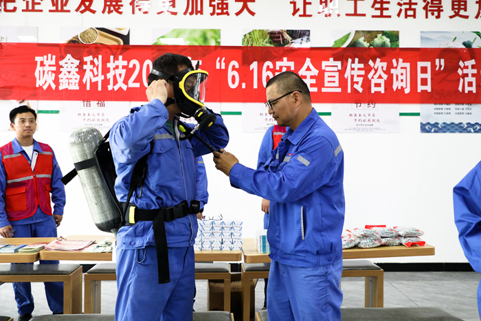 碳鑫科技采取現(xiàn)場教學(xué)的模式,對正壓式空氣器的穿戴使用方法進(jìn)行講解,提高職工安全技能(閆旭 攝)