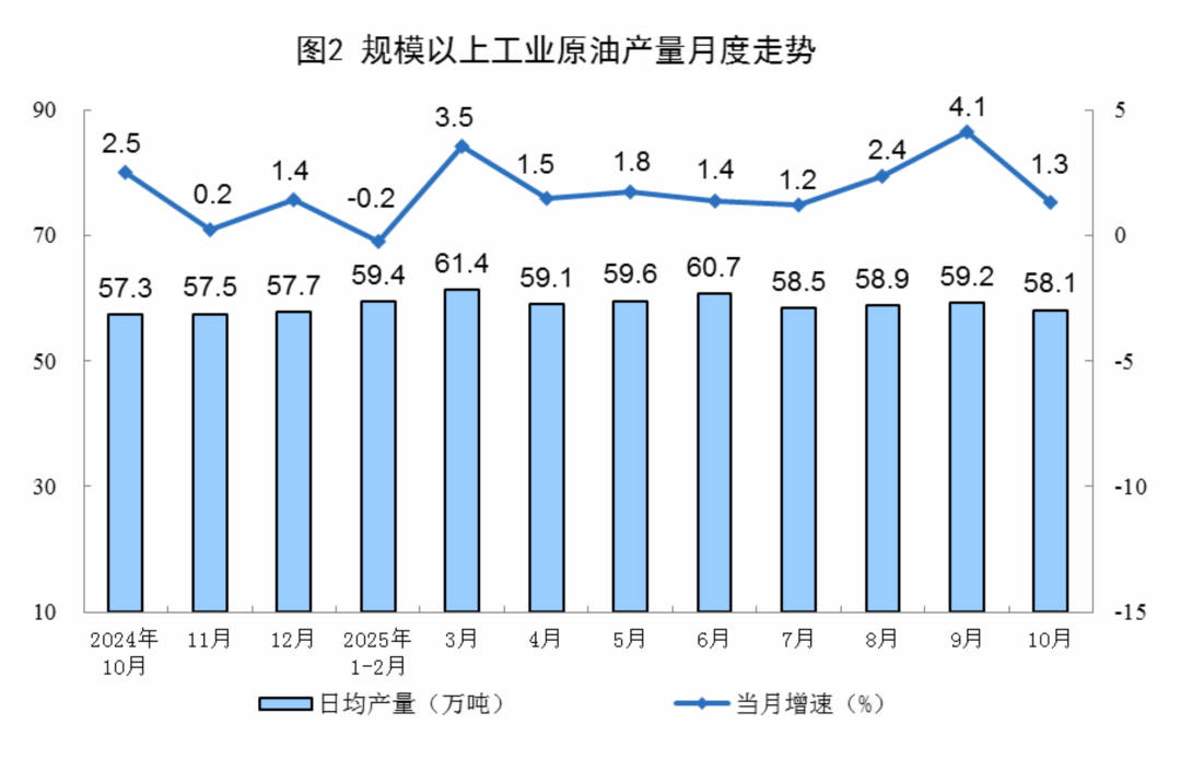 原油生產(chǎn)保持增長。10月份,規(guī)上工業(yè)原油產(chǎn)量1800萬噸,同比增長1.3%,增速比9月份放緩2.8個(gè)百分點(diǎn);日均產(chǎn)量58.1萬噸。1—10月份,規(guī)上工業(yè)原油產(chǎn)量18064萬噸,同比增長1.7%。原油加工平穩(wěn)增長。10月份,規(guī)上工業(yè)原油加工量6343萬噸,同比增長6.4%;日均加工204.6萬噸。1—10月份,規(guī)上工業(yè)原油加工量61424萬噸,同比增長4.0%。
